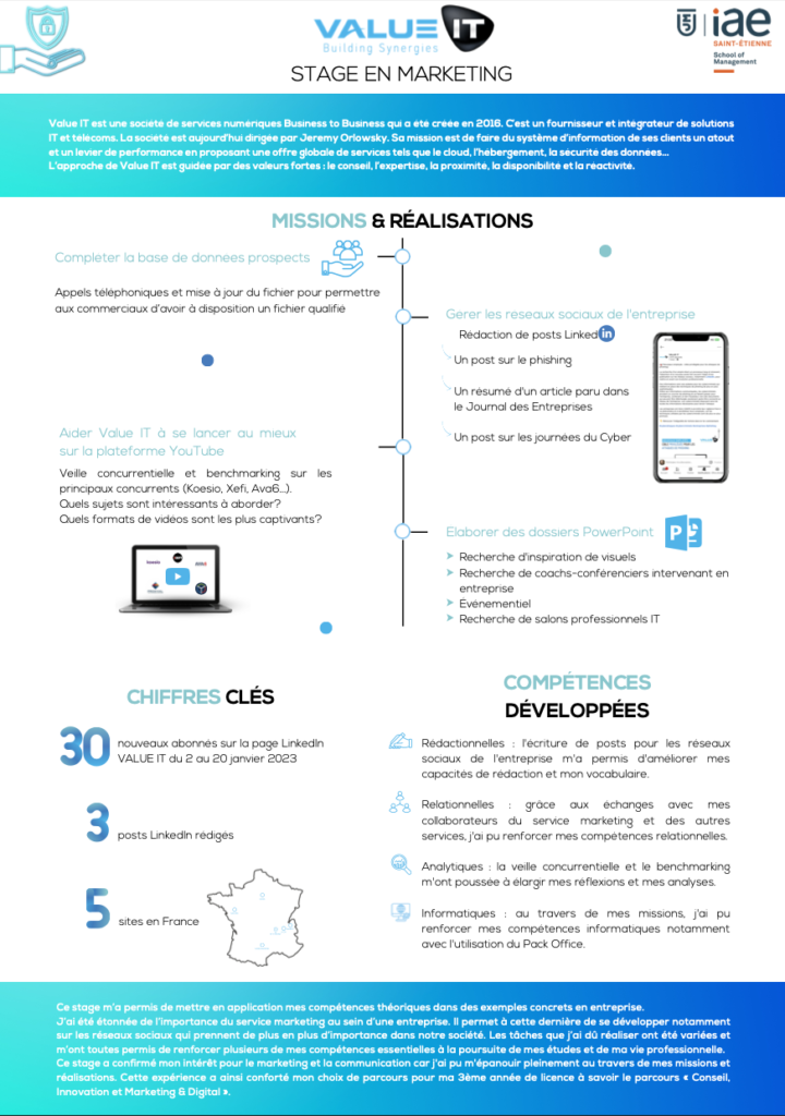Durant ce stage qui s’est déroulé en janvier 2023, j’ai pu réaliser différentes missions telles que la rédaction de posts pour les réseaux sociaux de l’entreprise (plus particulièrement LinkedIn) ou encore une veille concurrentielle/benchmarking sur le sujet de la vidéo puisque l’entreprise avait pour potentiel projet de produire et diffuser du contenu vidéo. J’ai donc fait un travail intensif de recherche sur les tendances qui plaisent, le type de contenu qui marche le mieux, sous quelle forme…